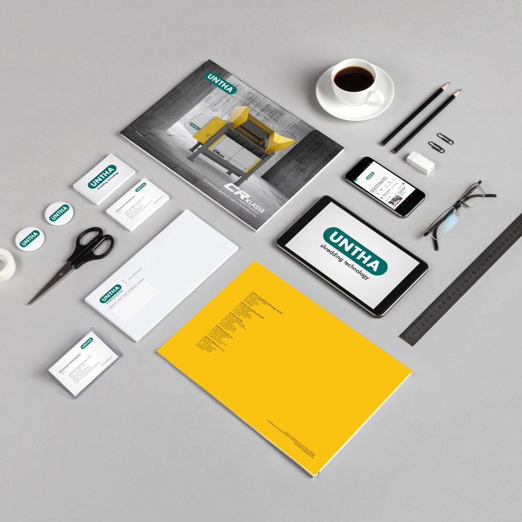 During my employment at UNTHA shredding technology, I had the task of developing and implementing a new corporate design. The specifications were not allowing me to change the existing colors and logo. Everything else should be changed. It was also desired that the new CD should be contemporary, contain a lot of white space and the main color should be yellow. Also, it was important not to lose the recognition value of the UNTHA brand. In the course of the project, I developed three concepts, of which the one shown one here was chosen and implemented by me.